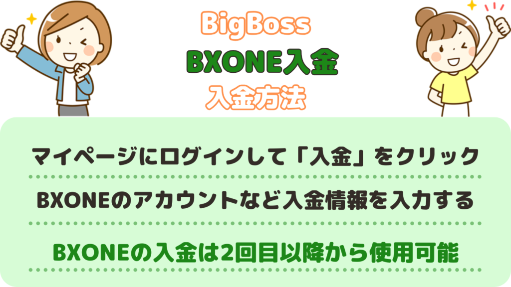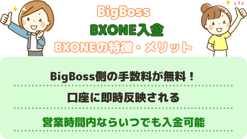BigBossでのBXONE入金は、手数料無料、すぐに反映される、高い安全性という特長があります。